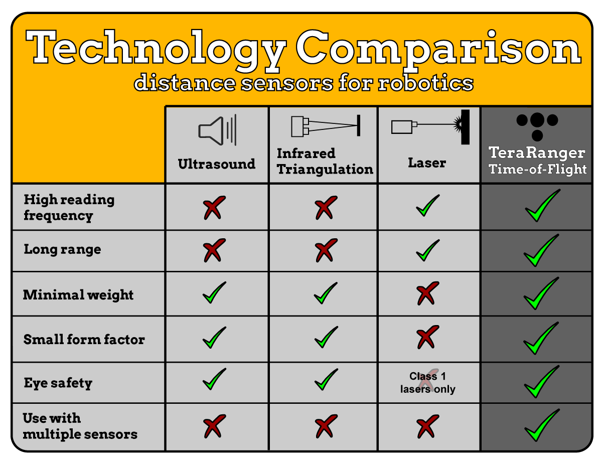 Technology based on time-of-flight (ToF) for range finding is very powerful when used with light rather than sound. Our sensors perform as well as lasers but are safer, smaller, lighter and less expensive! Compared to ultrasound, they provide far greater range, faster readings and greater accuracy whilst still maintaining their small size, low weight and low power consumption characteristics.